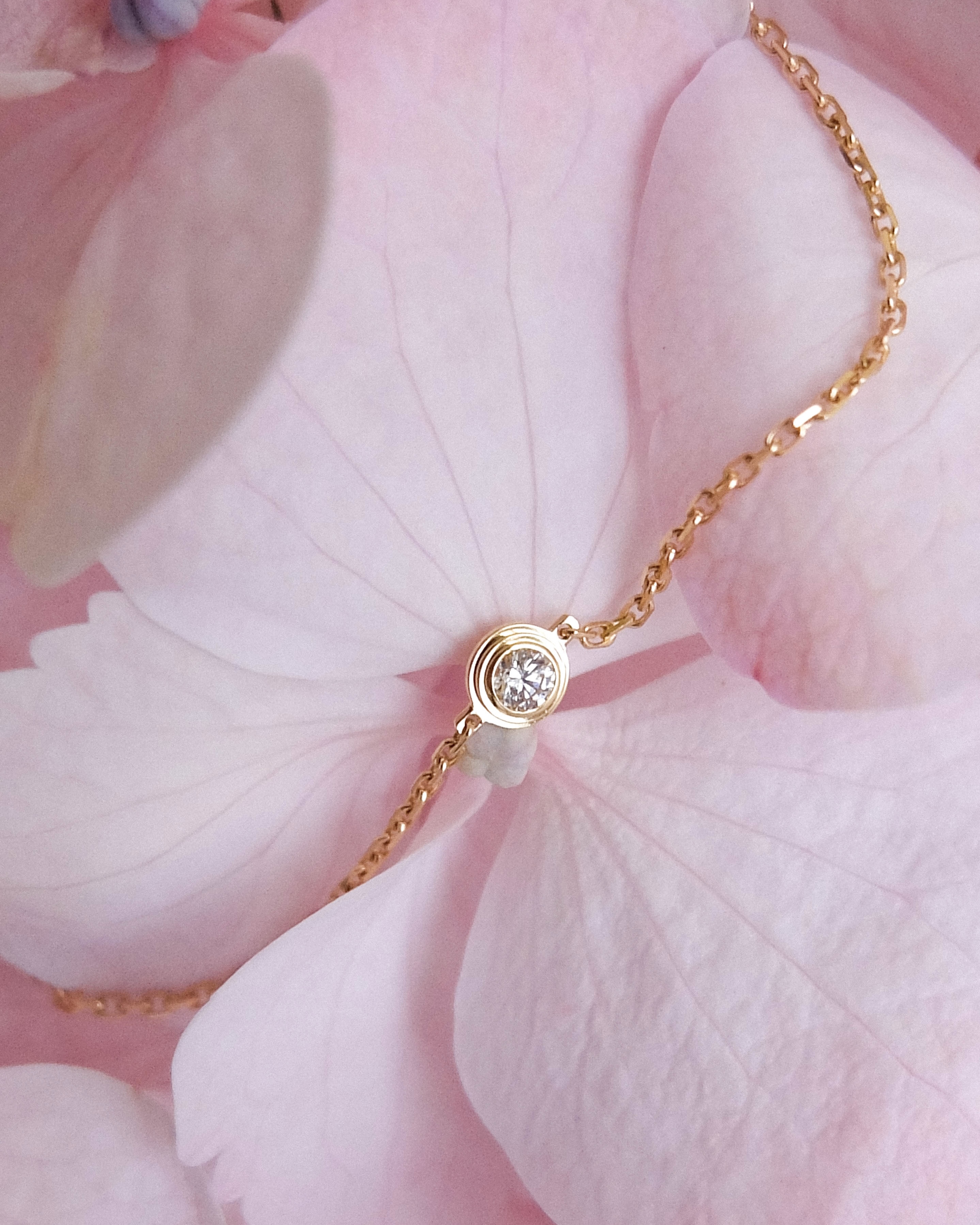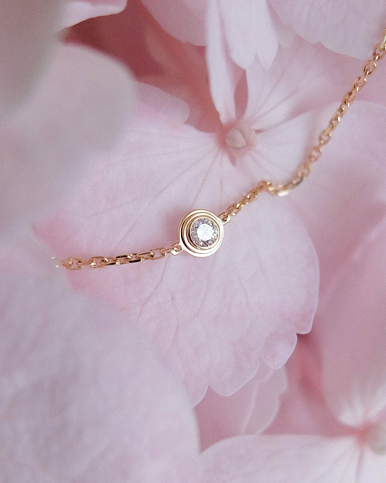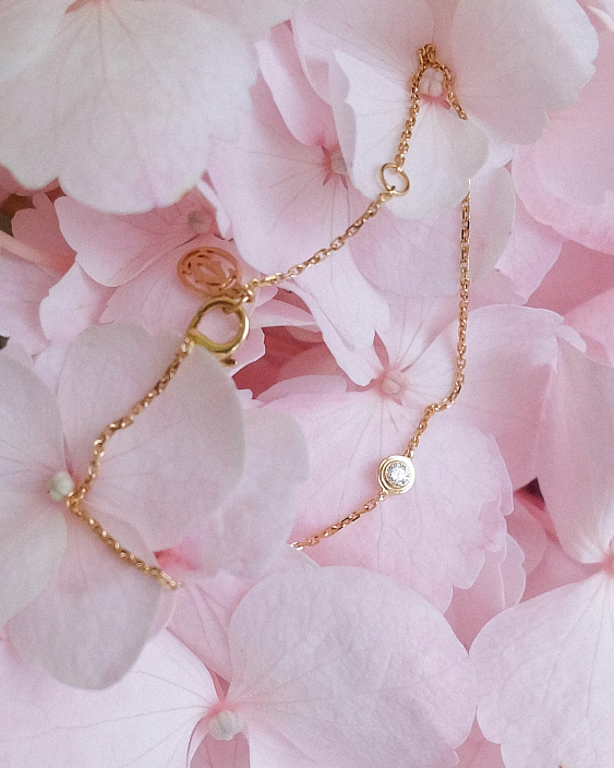 Центральным элементом браслета является великолепный бриллиант круглой огранки весом 0,04 карата. Этот камень обладает исключительной чистотой и блеском, благодаря чему он привлекает внимание и создает эффектный акцент на фоне теплого золота. Бриллианты известны своей способностью преломлять свет, и этот экземпляр не исключение — он искрится и сверкает при каждом движении.