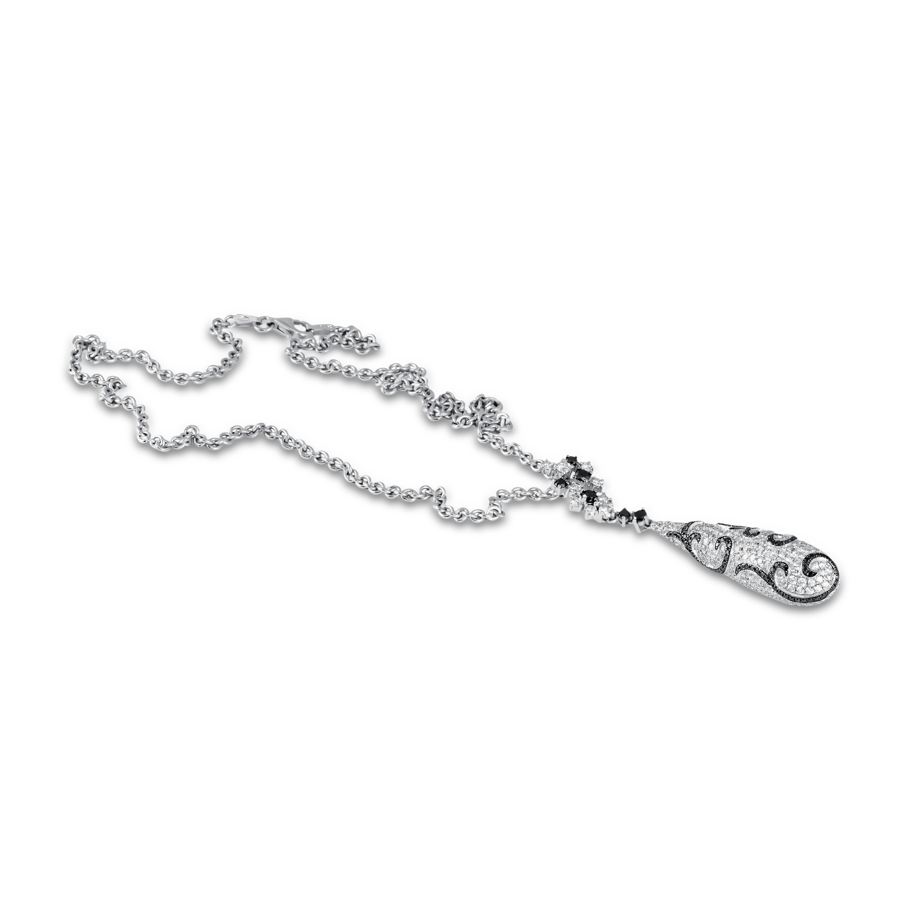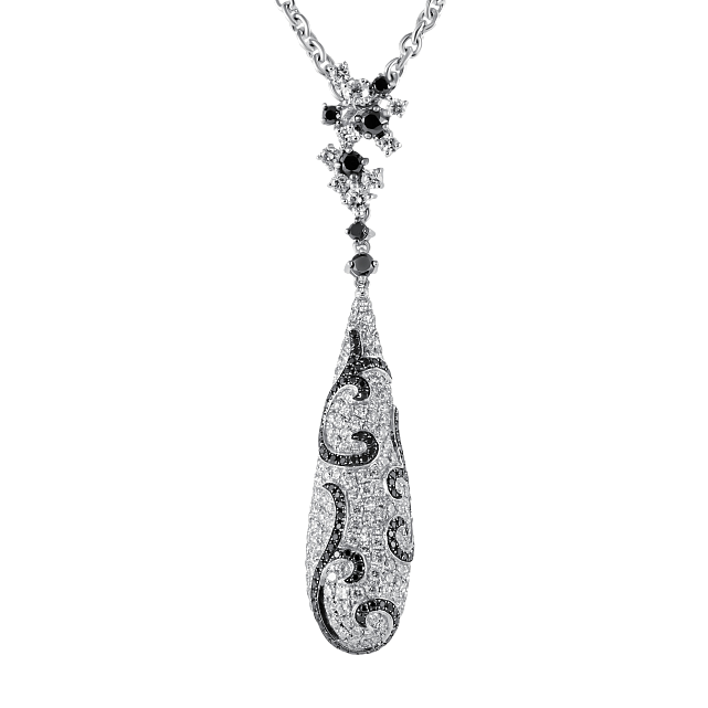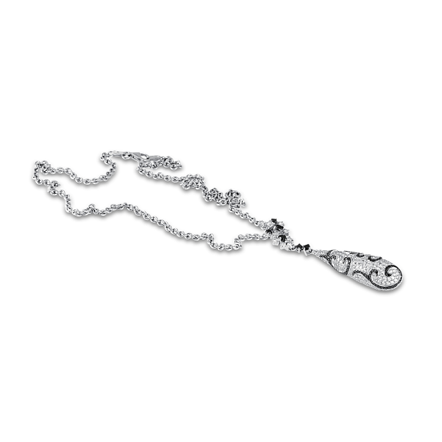 Колье представляет собой изящную цепочку с центральной подвеской в форме капли, усыпанную бриллиантами, что создает эффект легкости и изящества.