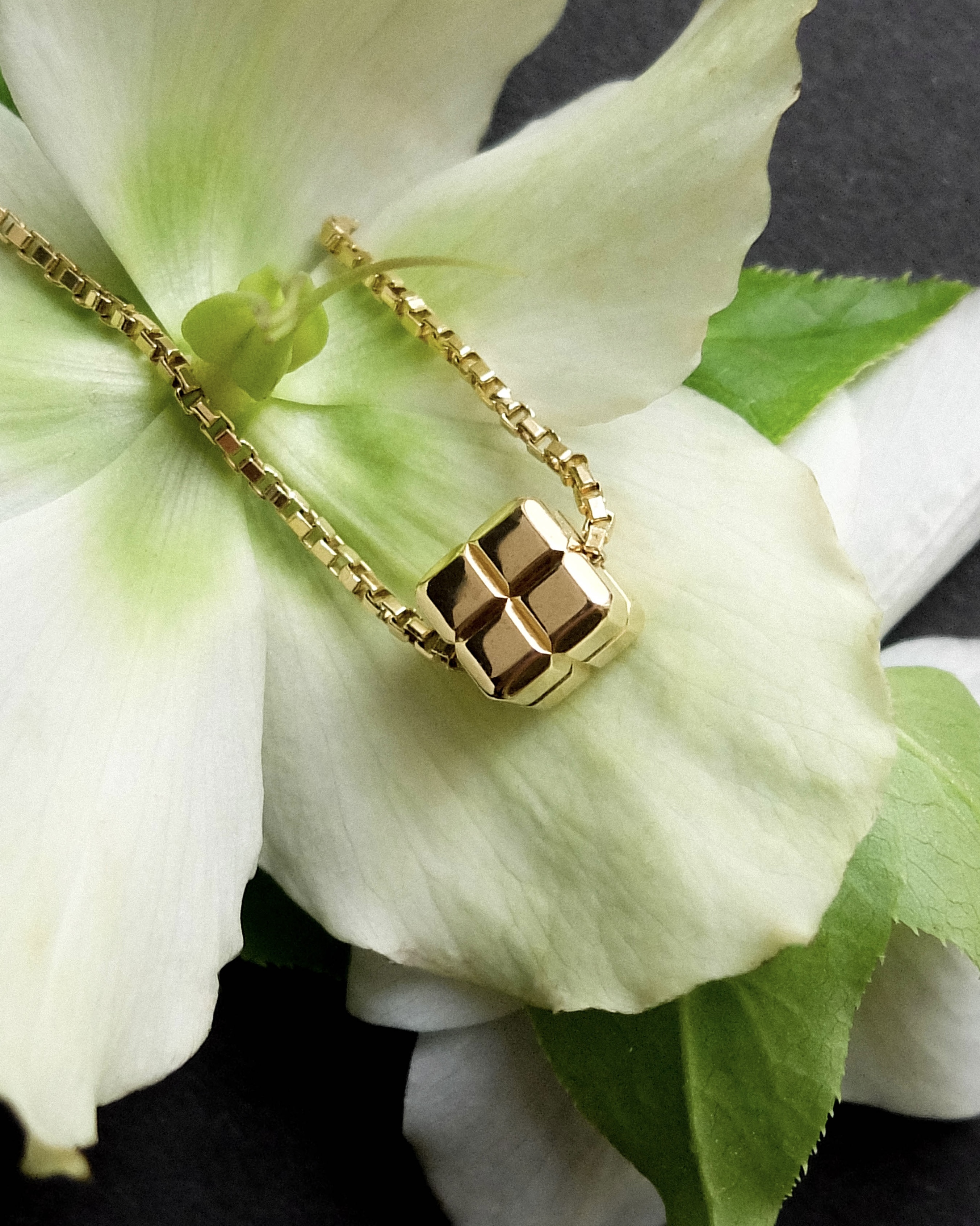 Дизайн колье вдохновлен формами льда и снега, что отражает название коллекции Ice Cube. Каждая грань колье тщательно обработана, создавая эффект многогранности и игры света. Элементы колье могут варьироваться от гладких до рифленых, что добавляет интересные текстурные контрасты.
