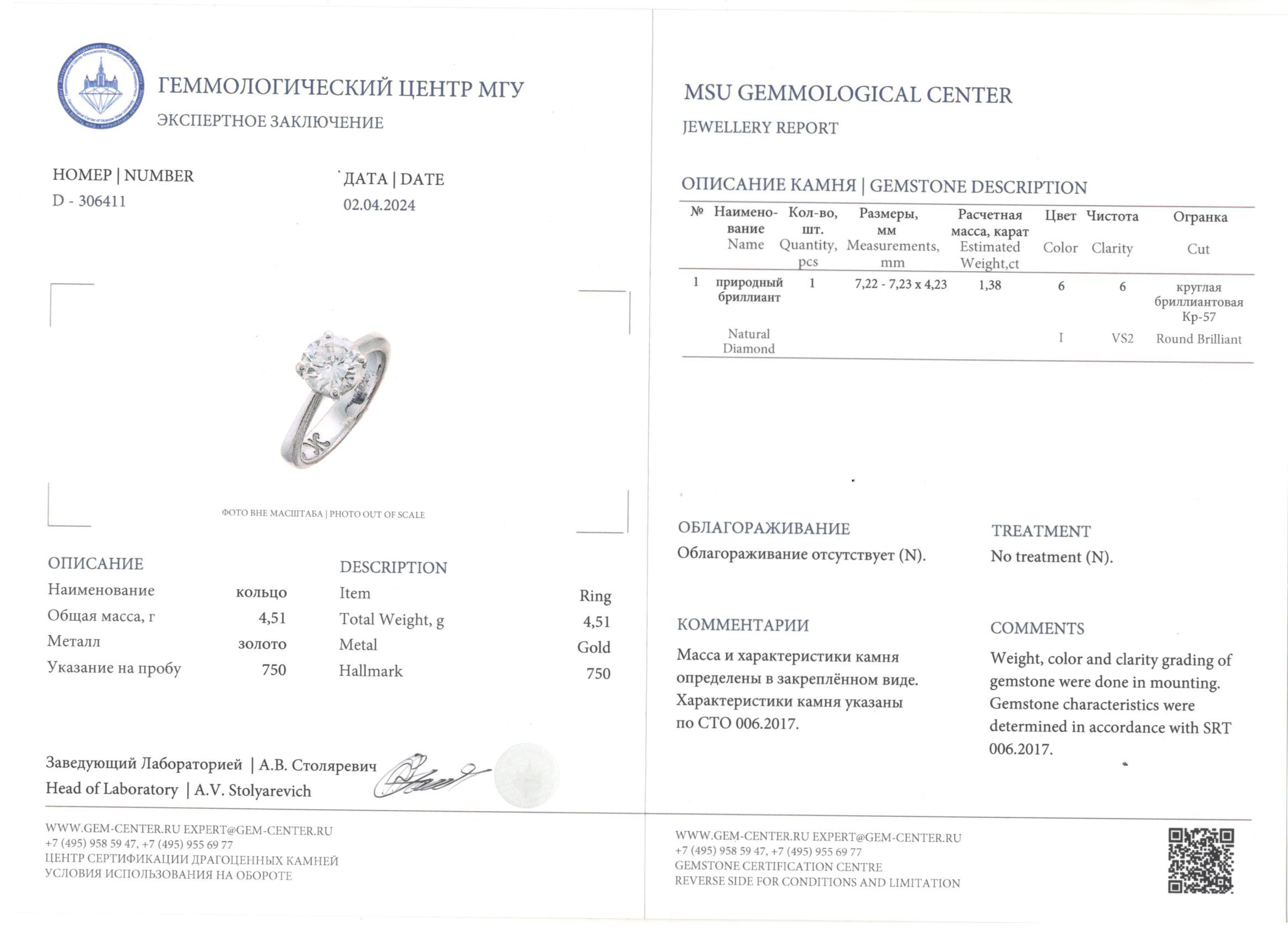Это роскошное и величественное кольцо с бриллиантом 1,38 карат является воплощением безупречной красоты и элегантности. Созданное мастерами высочайшего класса, оно станет настоящим украшением для утонченных ценителей драгоценных камней.