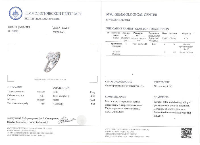 Это бриллиантовое кольцо с камнем 1,38 карата – настоящее произведение искусства, созданное природой и мастерами ювелирного дела. Оно станет не только роскошным украшением, но и символом вашей любви, преданности и успеха. Позвольте ему сиять на вашей руке, привлекая восхищенные взгляды и восторженные комплименты.