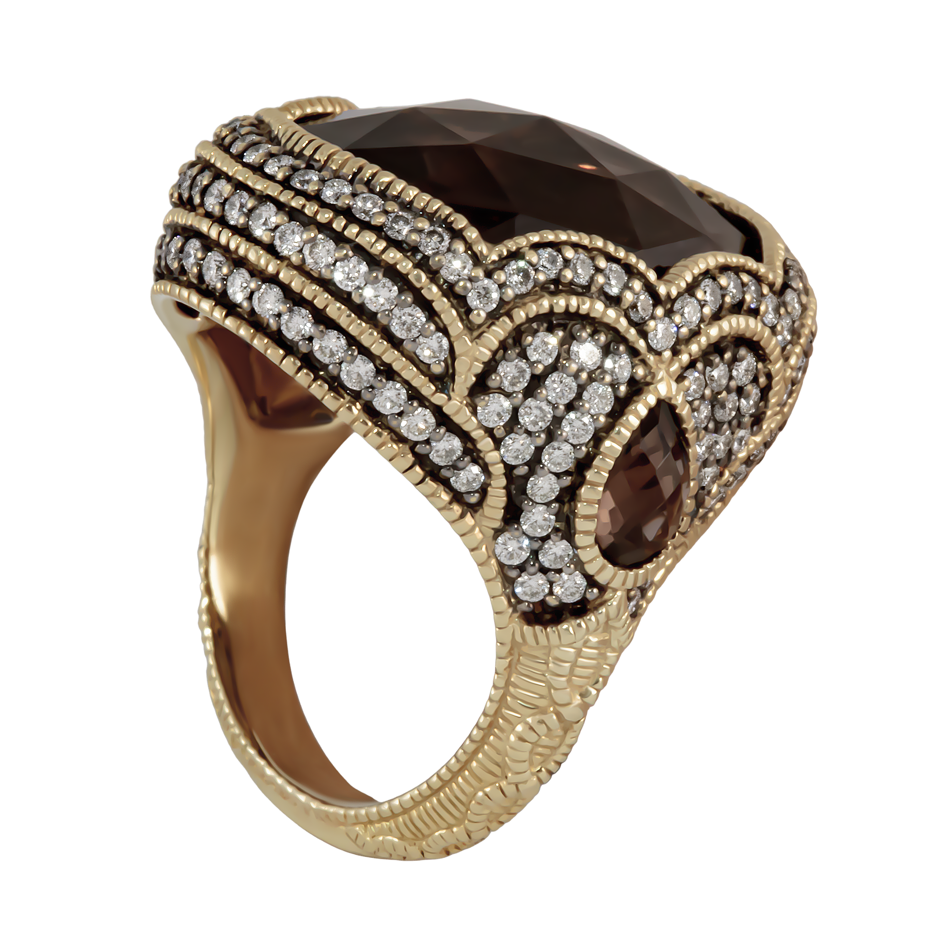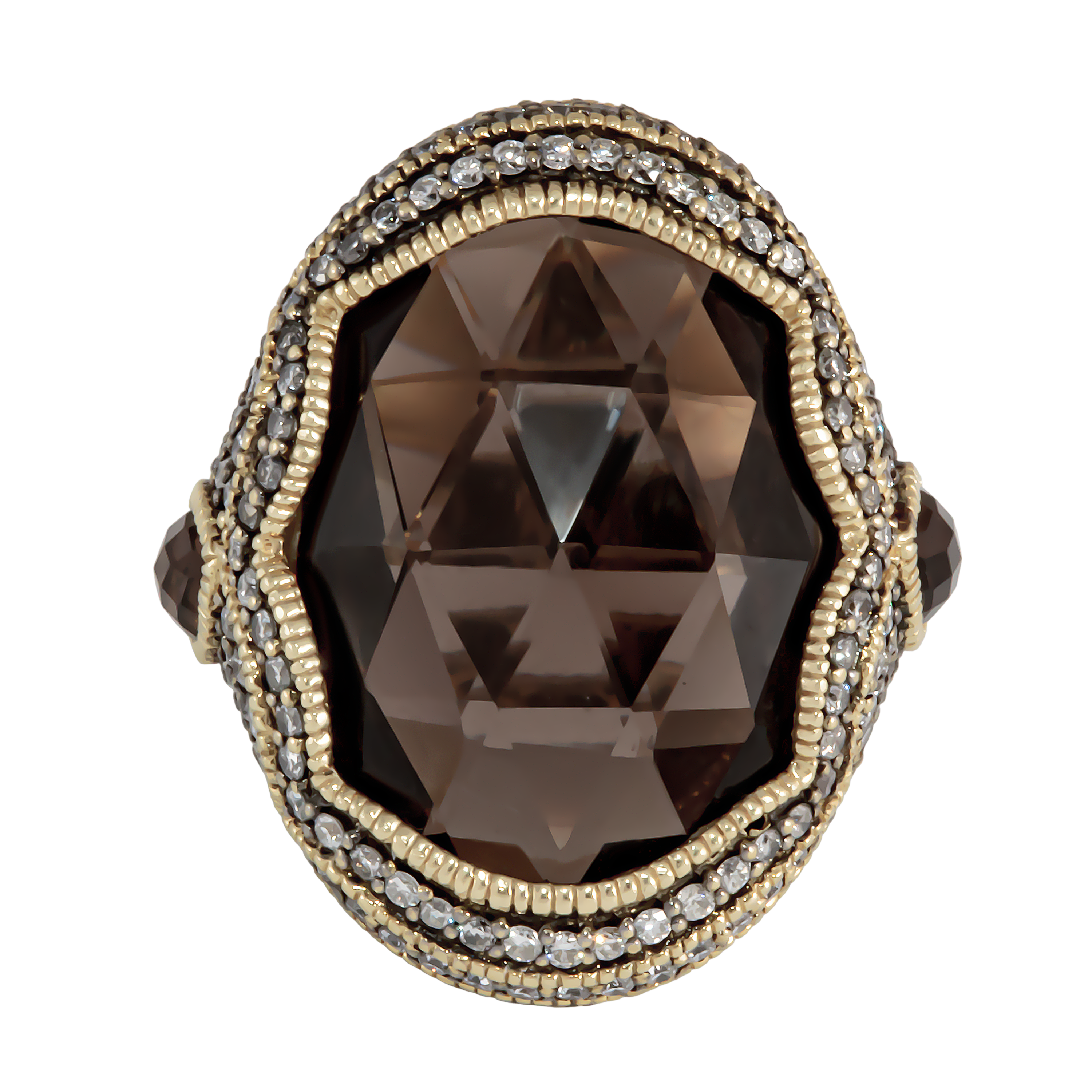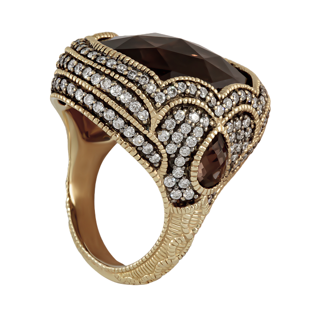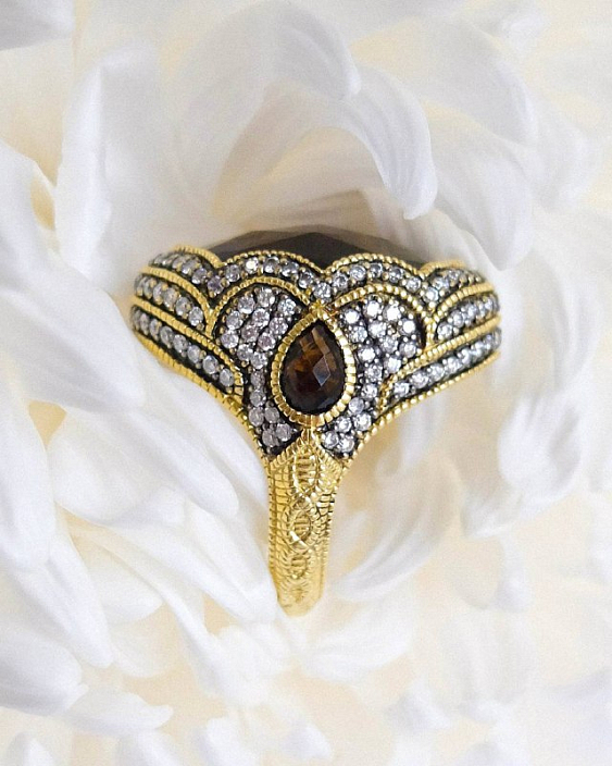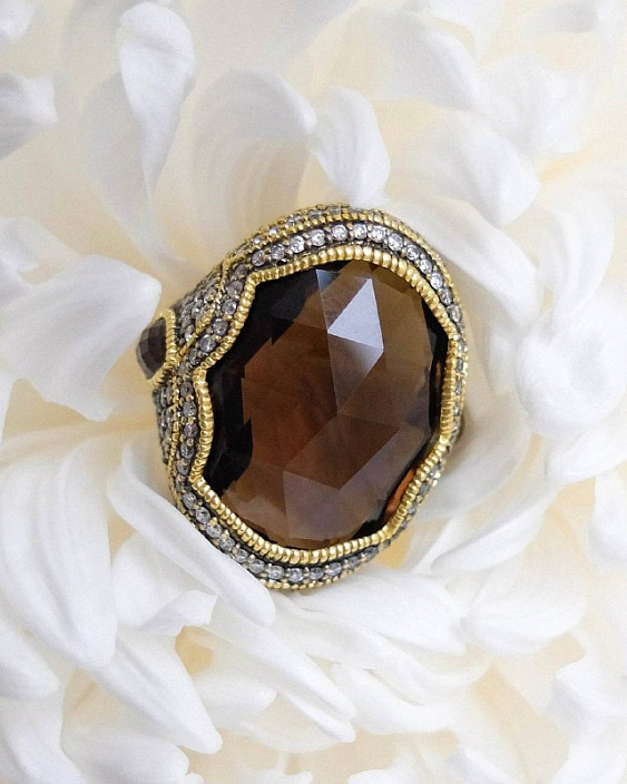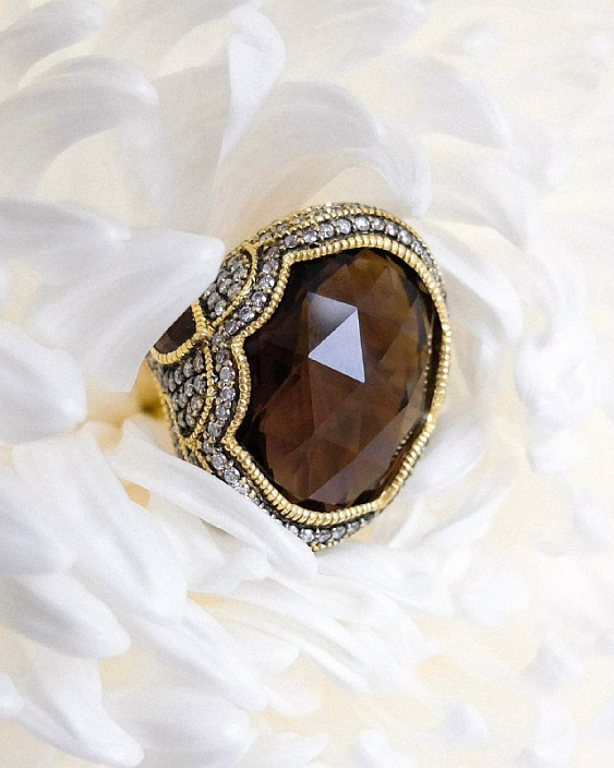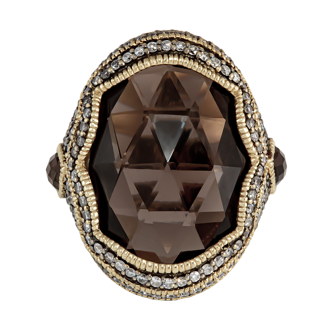 Дизайн кольца Judith Ripka отличается утонченностью и оригинальностью. Центральный элемент — дымчатый кварц — привлекает внимание своим глубоким цветом и прозрачностью. Он окружен великолепной рамкой из бриллиантов, которые добавляют кольцу блеска и элегантности. Каждая деталь продумана до мелочей, что делает это украшение поистине уникальным.
