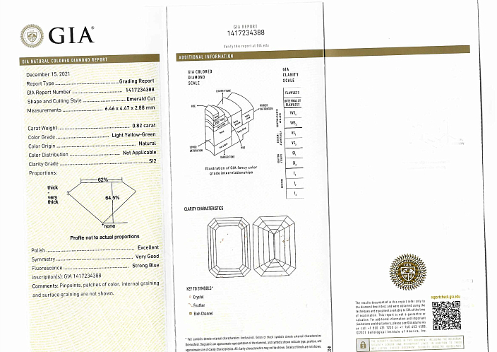 Бриллиант природный 1 шт. огранки "Изумруд" 0,82 ct Light Yellow-Green/SI2, Бриллианты 1,98 ct 3/4