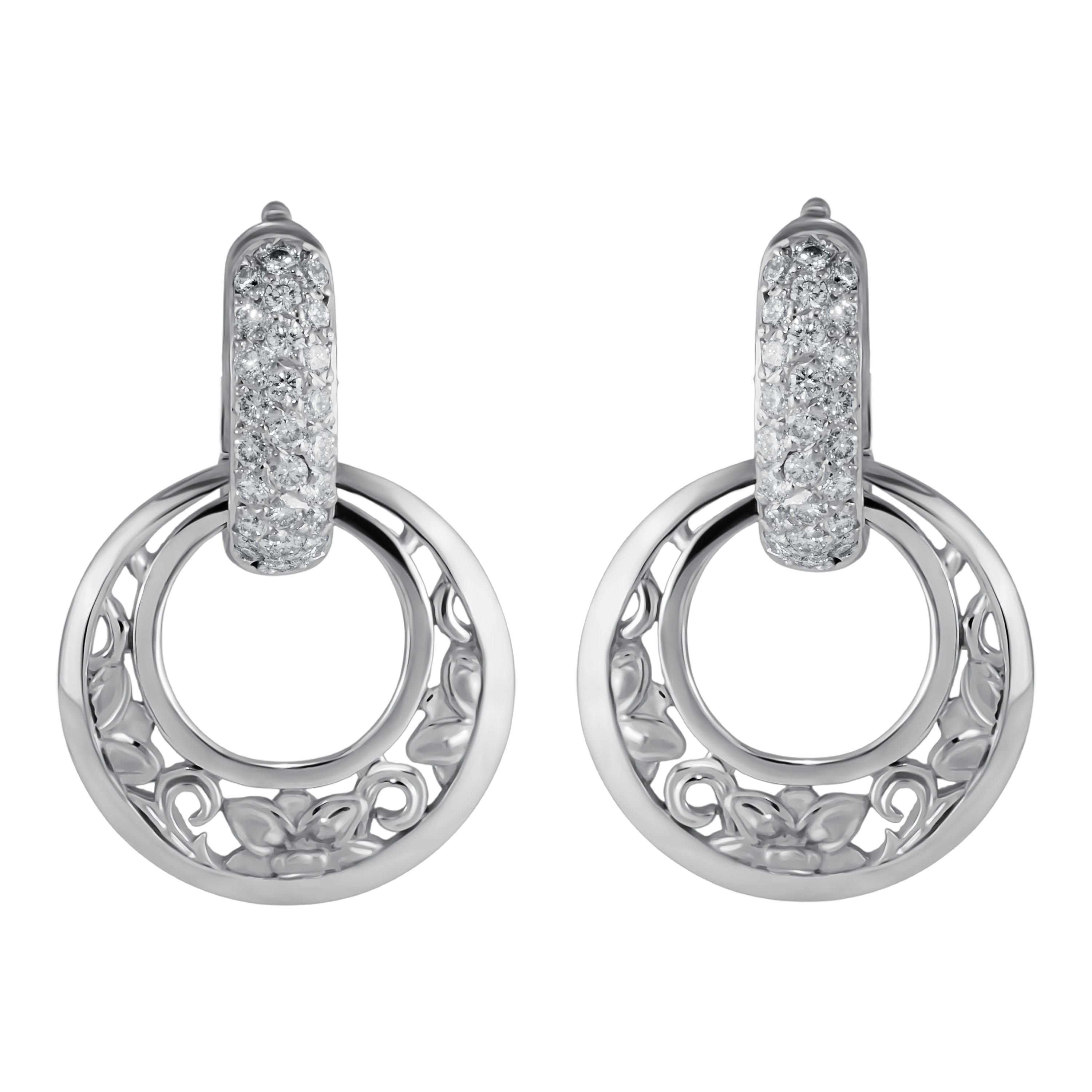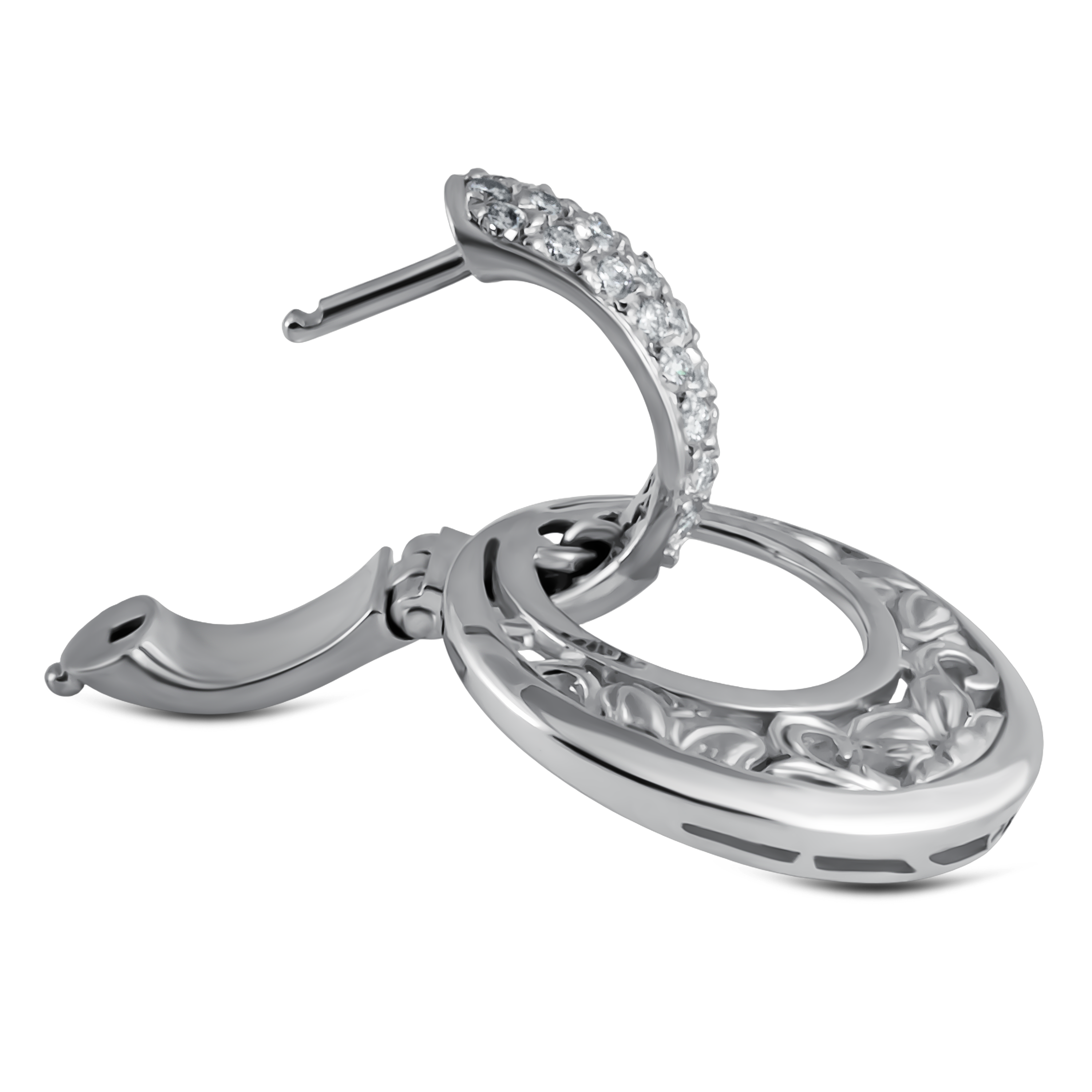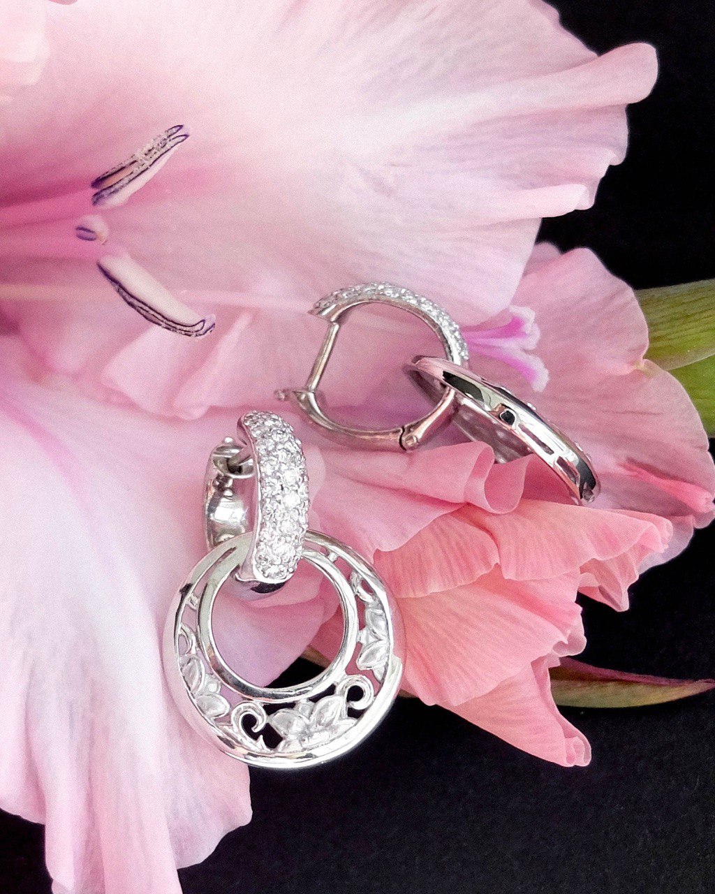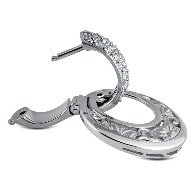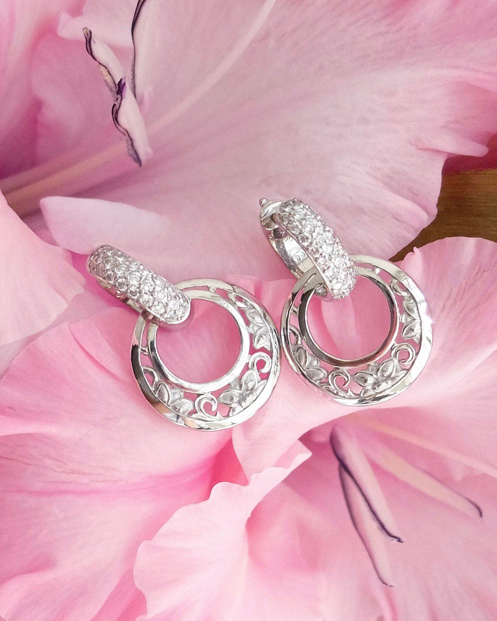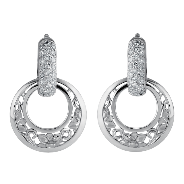 Дизайн серёг Jasmin вдохновлён красотой цветка жасмина. Каждая серьга имеет форму, напоминающую изящные лепестки этого цветка. Белое золото в сочетании с блестящими бриллиантами создаёт гармоничную палитру, которая привлекает внимание и восхищает своим великолепием.