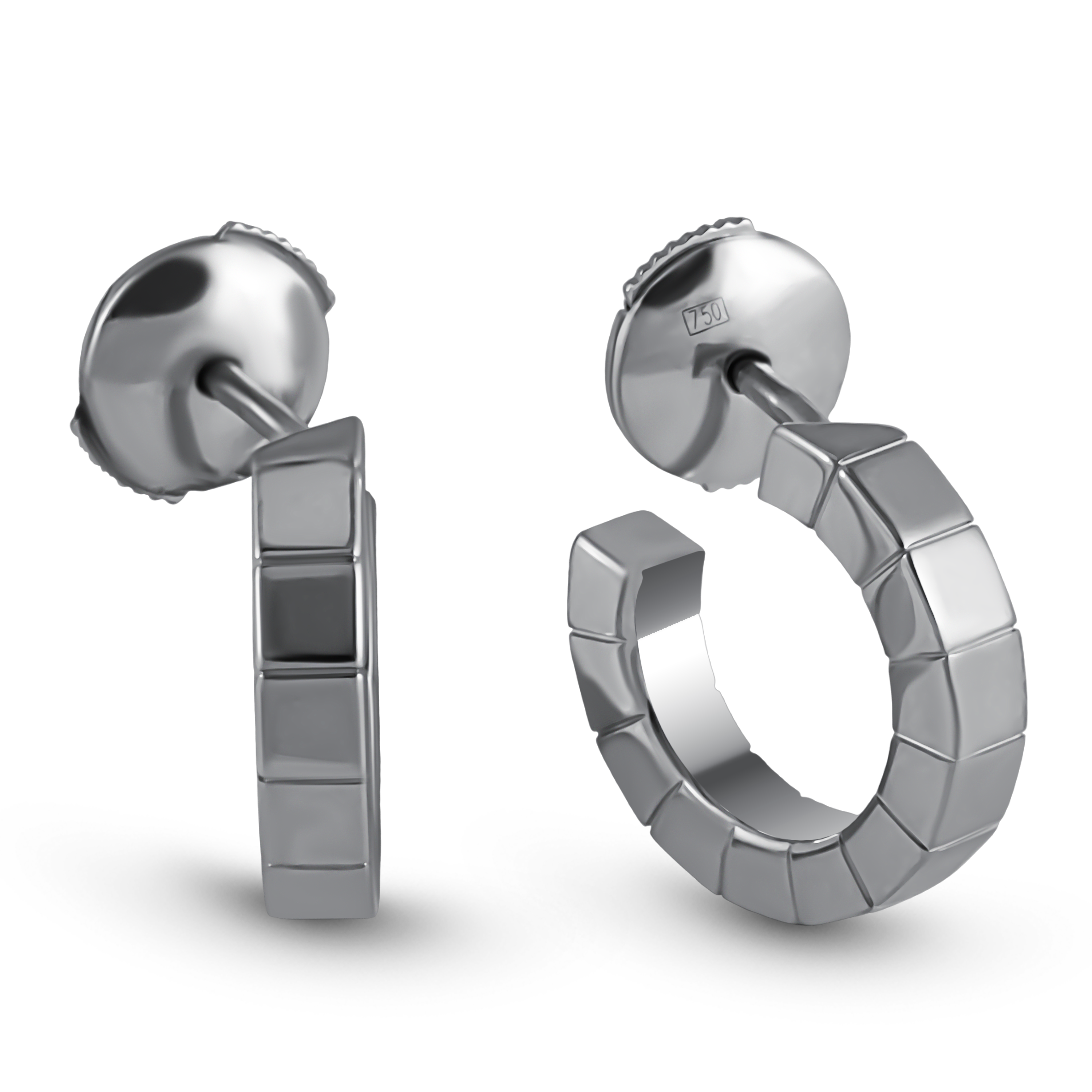 Серьги имеют оригинальную форму, которая сочетает в себе геометрические линии и плавные изгибы. Они выполнены в виде переплетенных полос, что создает эффект легкости и воздушности. Белое золото 750 пробы придает изделию особый блеск и стойкость к повреждениям, что делает их идеальными для повседневного ношения.