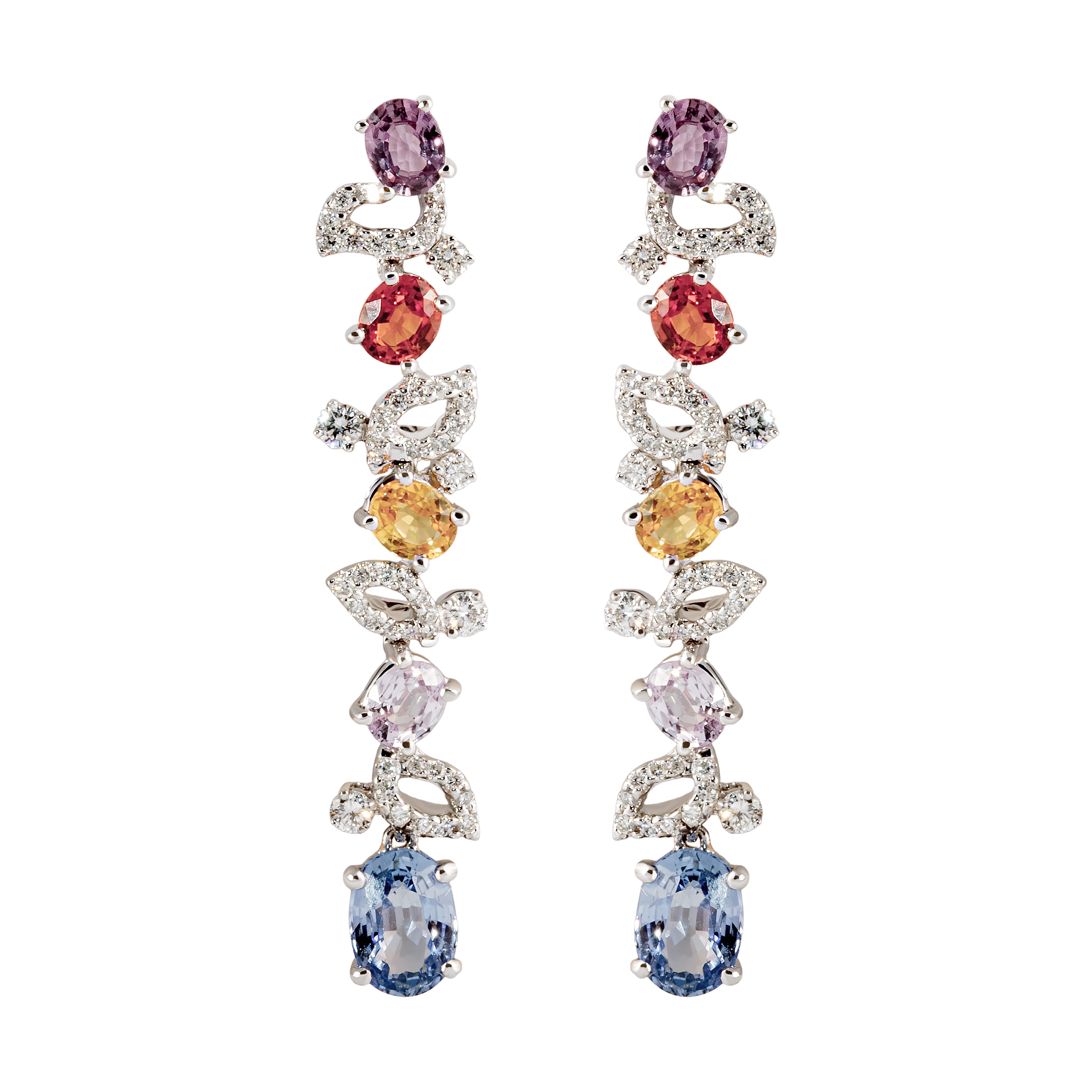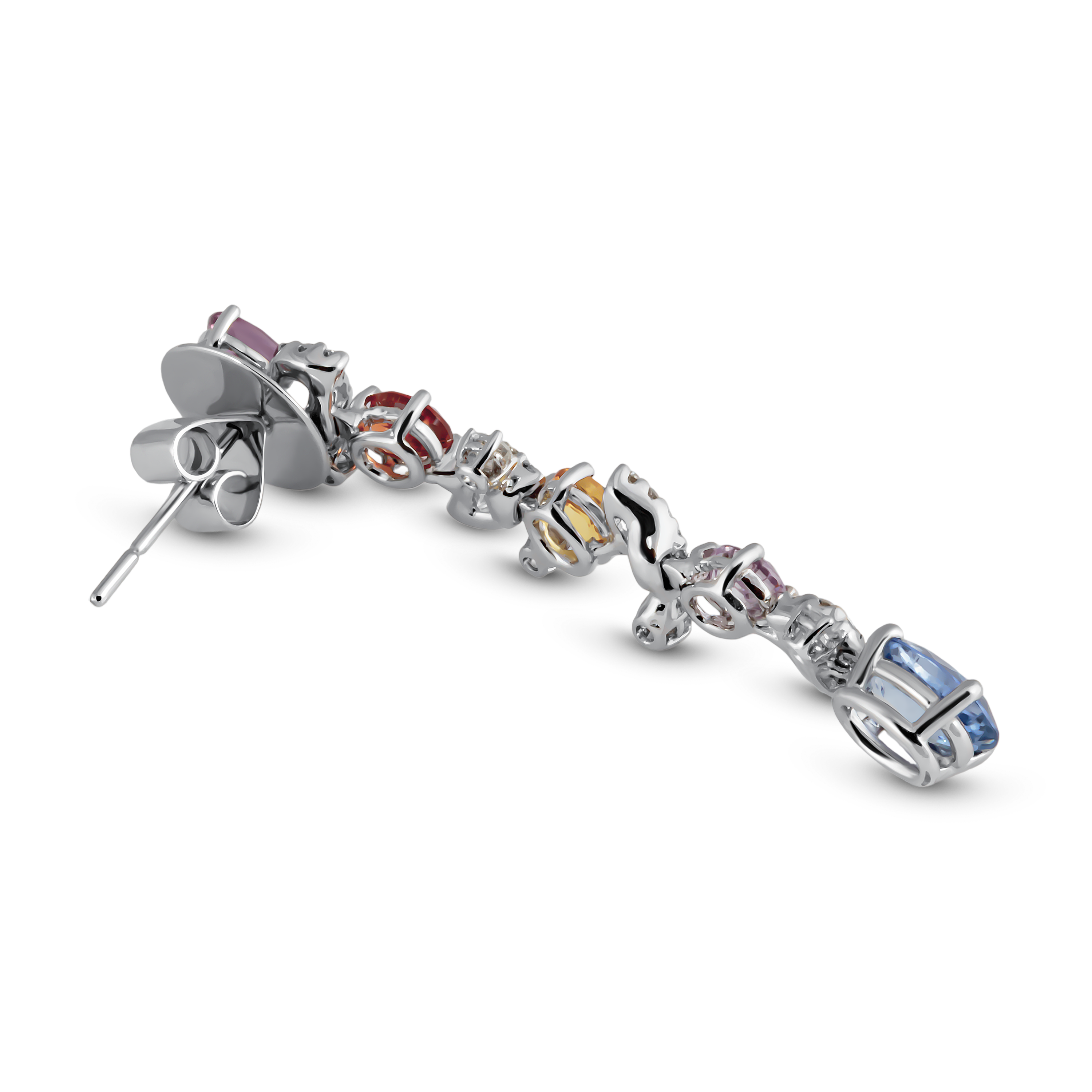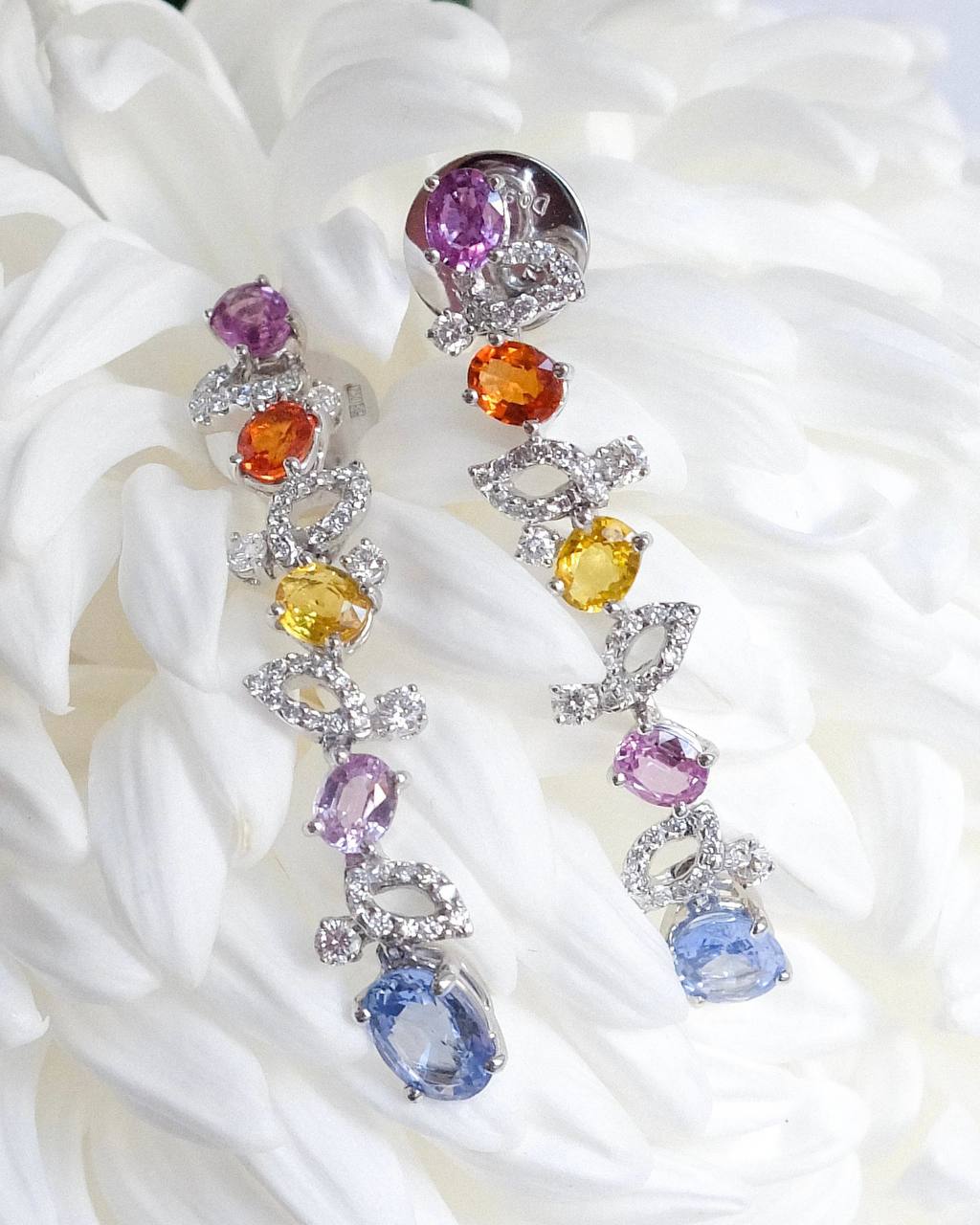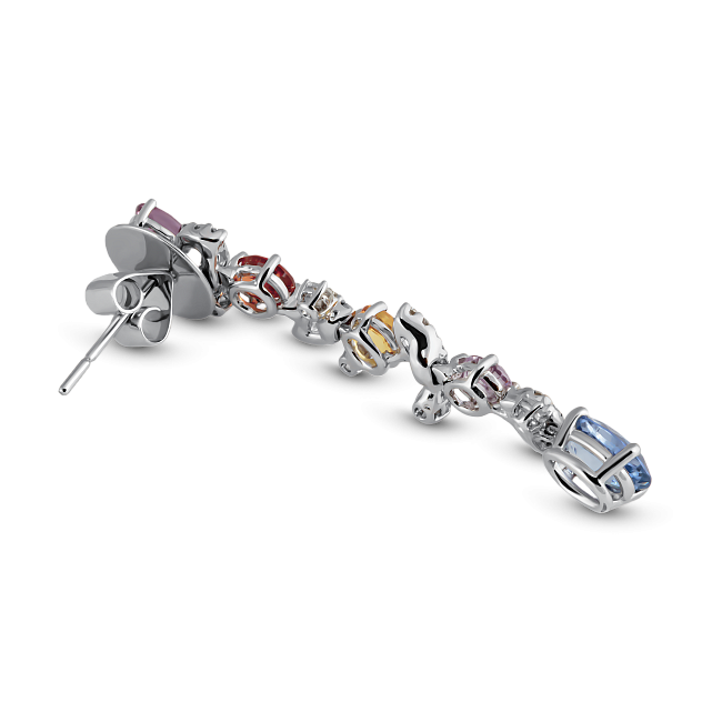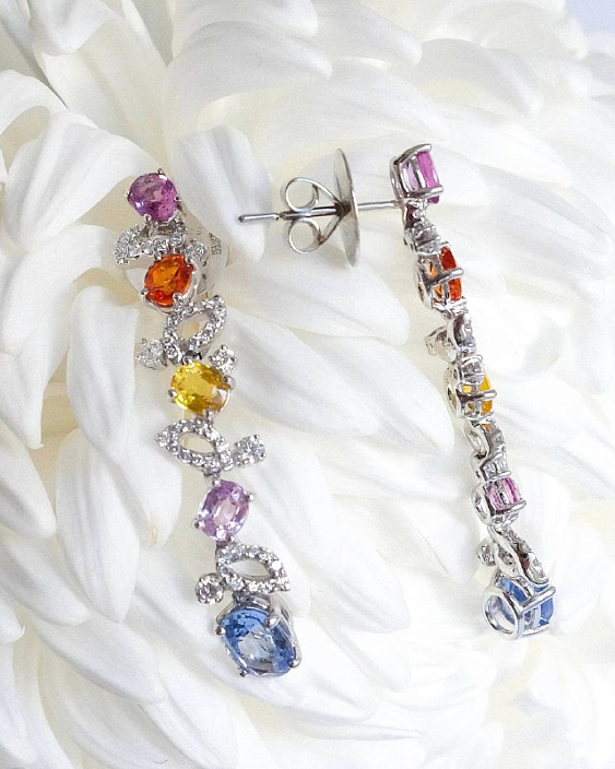 Серьги с цветными сапфирами и бриллиантами из белого золота 750 пробы — это великолепное ювелирное изделие, которое станет настоящим украшением для любой женщины. Эти серьги идеально сочетают в себе элегантность, стиль и высокое качество, что делает их идеальным выбором для особых случаев или повседневной носки.